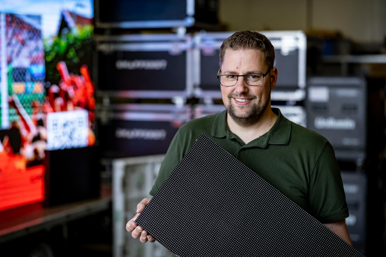 Na die periode valt het kwartje. “We dachten: zo’n ledscherm is eigenlijk best iets.” De creatieve en inventieve Marc koopt zijn eerste eigen scherm: twee meter hoog, tweeënhalve meter breed, op een aanhanger. “Buiten, op locatie.” Inmiddels is Snappshot-LED een aparte tak, samen met collega Thomas (24), die verantwoordelijk is voor de techniek. “Ik ben van de verkoop en het commerciële deel,” zegt Marc. Wat hij vooral belangrijk vindt, is laten zien dat Snappshot-LED een vak is. “Led is niet iets wat je er zomaar even bij doet. Wij kunnen zelf repareren, ledjes solderen en storingen oplossen. We leveren kwaliteit en weten waar we het over hebben. En gaat het onverhoopt mis, dan lossen we het altijd op.”